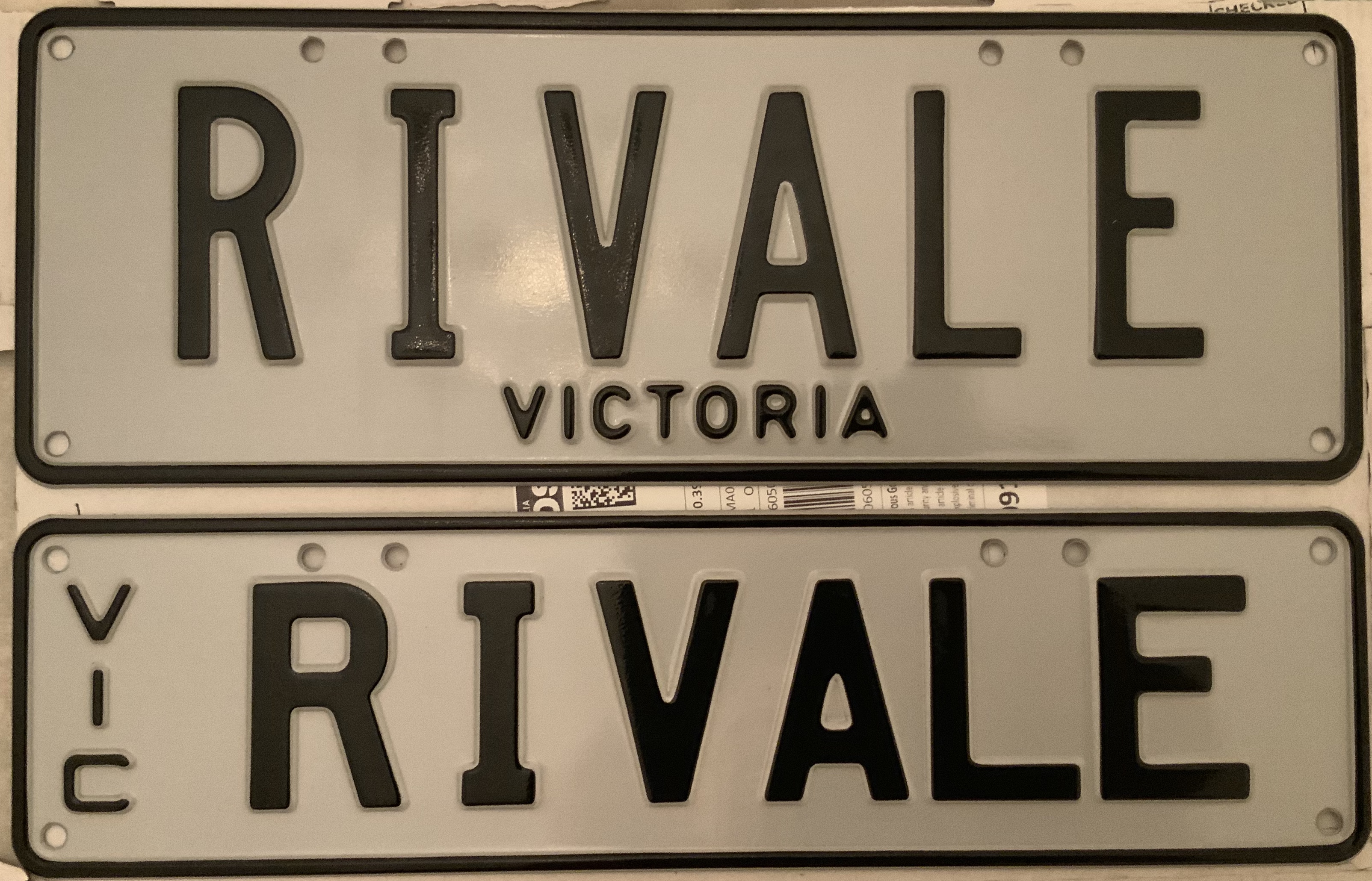 One Slimline plate and one standard size plate. Silver background with Black text. Brand new, still in box.